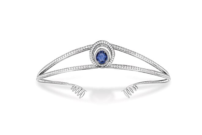 The «Reine de Naples» Jewellery Set is composed of a ring, a pair of earrings, a necklace and a tiara. Each of these jewels is in 950 platinum, the noblest and most resistant material found in jewellery today. The central motif of the jewels in the «Reine de Naples» jewellery set is an oval-cut blue sapphire. It is surrounded by two ovoid rings paved with baguette-cut diamonds in an elegant and refined echo of the case of the first wristwatch, which had an oblong shape.